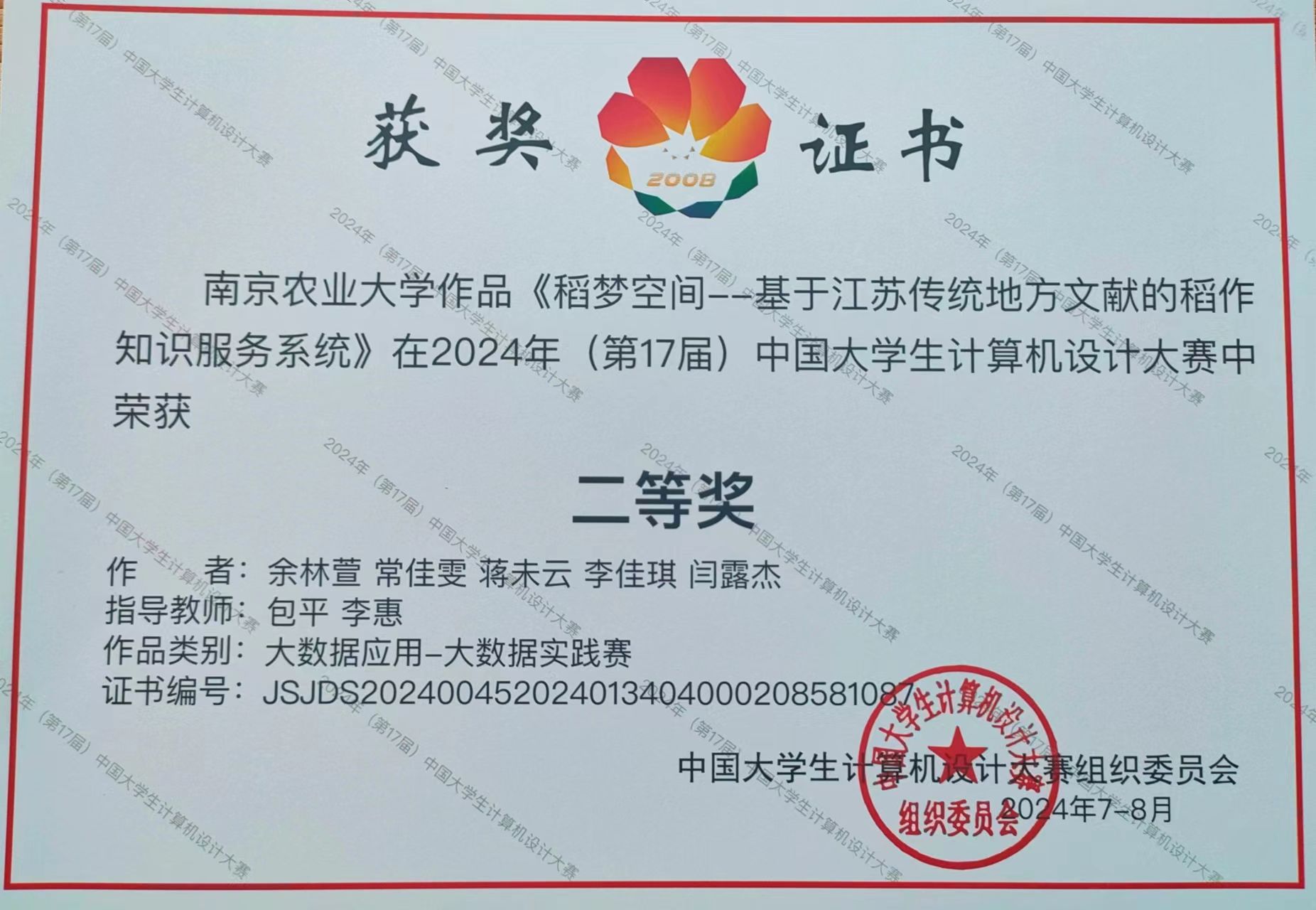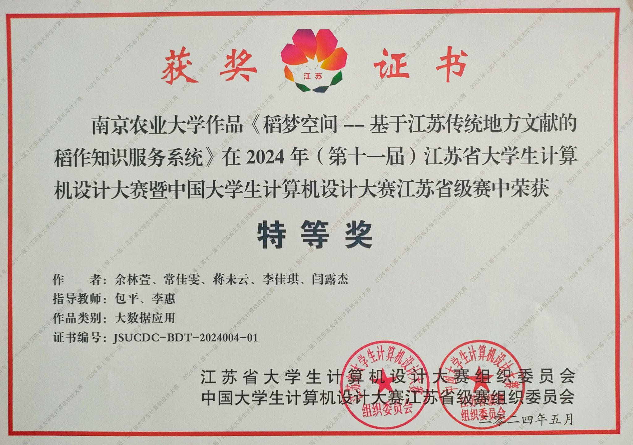 选送作品《稻梦空间——基于江苏传统地方文献的稻作知识服务系统》从全国优秀学子的激烈角逐中脱颖而出,荣获全国决赛二等奖及江苏省省赛特等奖,指导教师包平、李惠获得“优秀指导教师”称号,这是我校在该赛道中首次获得此殊荣。