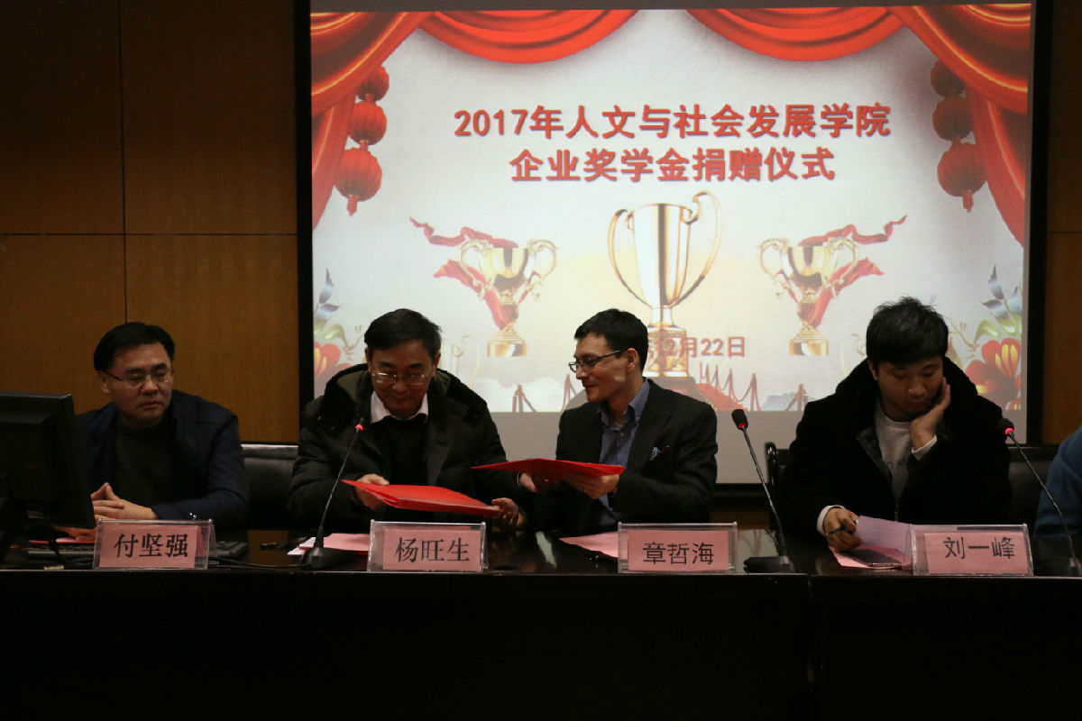 院长杨旺生分别与杭州瑞银旅业有限公司董事长章哲海先生、江苏山合水旅游文化发展有限公司签约设立奖学金协议。
