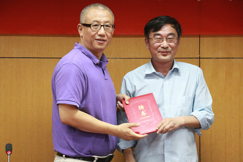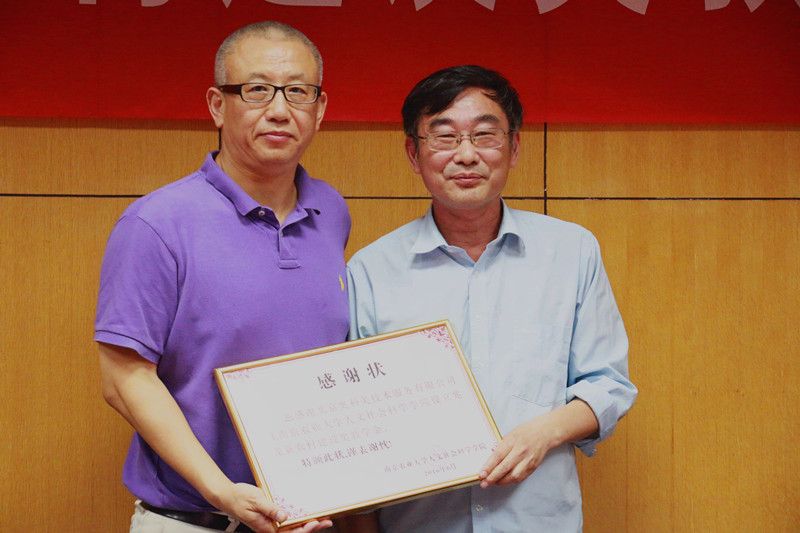 典礼伊始,杨旺生教授向“兆龙新农村建设奖教学金”的设立方------北京奥科美技术服务有限公司颁发了感谢状,并对蓝海先生在农业、新农村建设以及农业教育方面的支持表达了衷心的感谢。之后,杨旺生教授向王航先生、蓝海先生颁发了人文院兼职教授的证书。