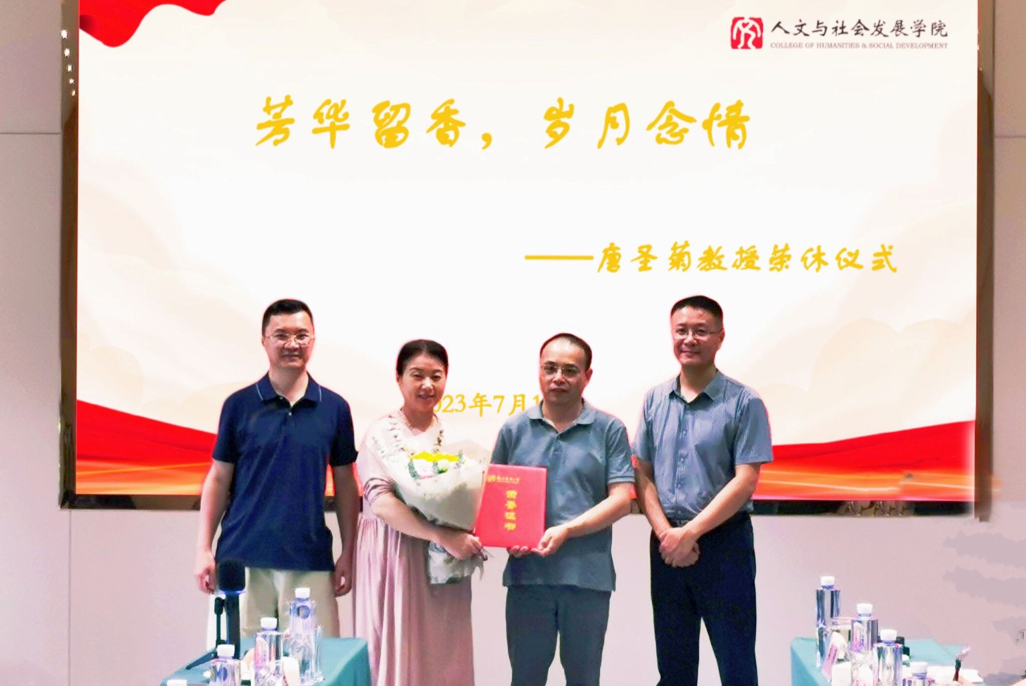 会议恰逢艺术系唐圣菊教授退休之际,同时举办了唐圣菊老师的荣休仪式。仪式现场,温情洋溢,李日葵和卢勇代表学院为唐圣菊老师对教育事业的付出表示衷心的感谢,邹建文给唐圣菊老师颁发了荣休证书并赠送了鲜花与荣休礼物。半生奋斗,一路芳华,唐圣菊老师在艺术系任教数十载,为专业的发展与建设做出了很大的贡献,仪式期间,她对学院和学校的认可和关心表示感谢,表示自己仍会一如既往地关心学院和学校的发展,衷心祝愿学校、学院、艺术系取得更加辉煌的成绩。