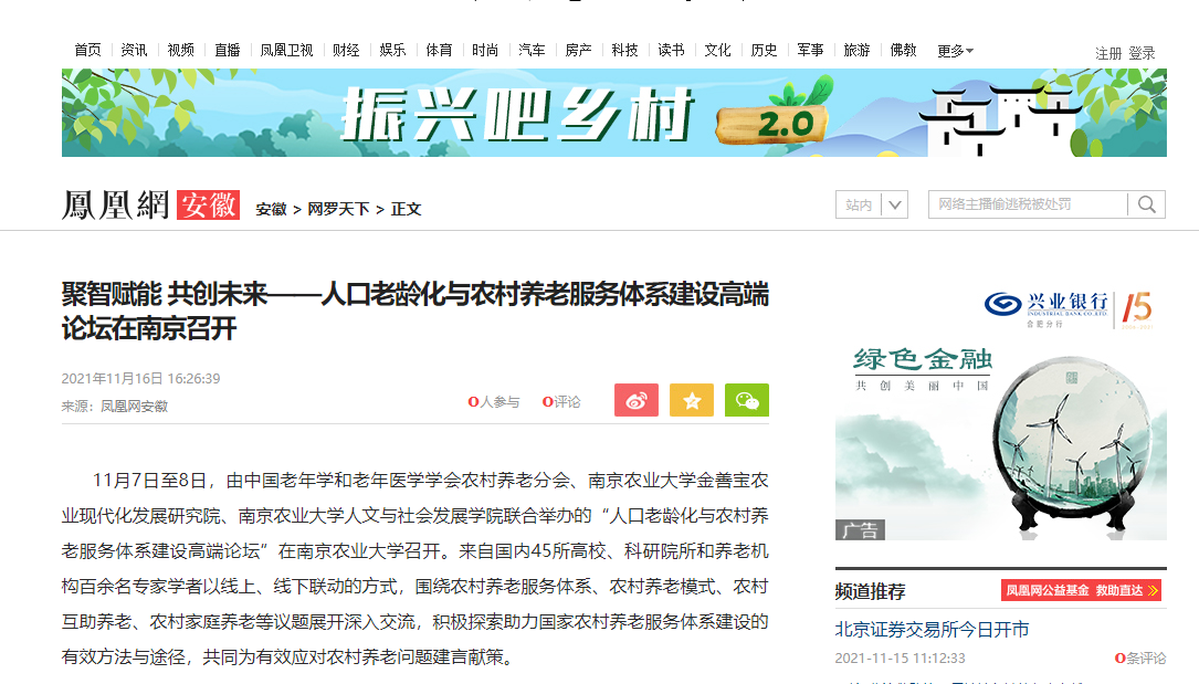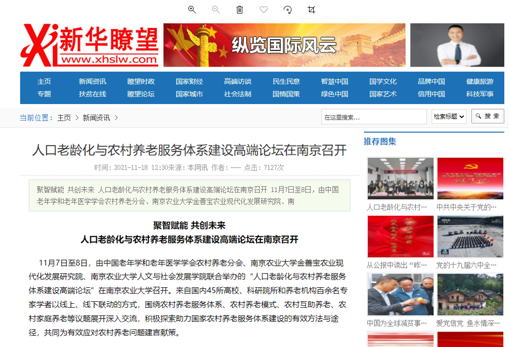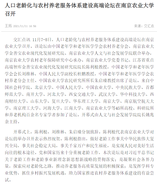 金善宝农业现代化发展研究院举办了人口老龄化与农村养老服务体系建设高端论坛。论坛获得多家媒体的关注和报道。