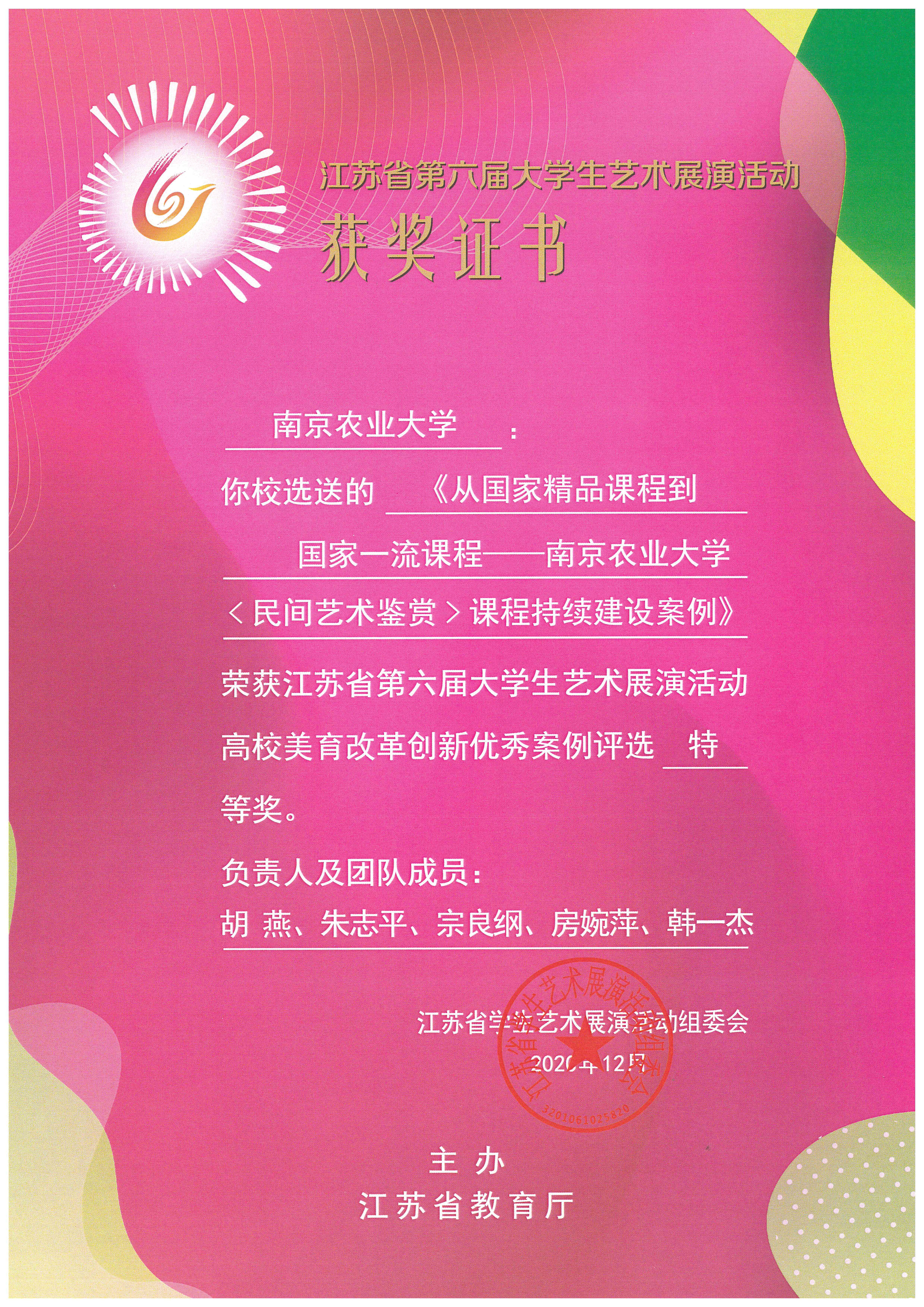 〈民间艺术鉴赏〉课程持续建设案例》,于2020年12月参加江苏省第六届大学生艺术展演活动,荣获全省高校美育改革创新优秀案例特等奖,并由江苏省教育厅选送参加教育部主办的全国第六届大学生艺术展演活动。