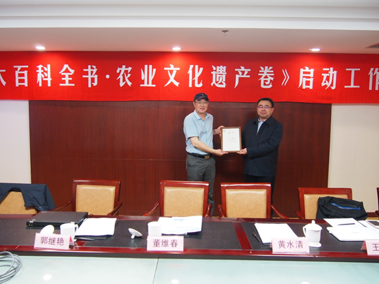 副院长路璐和相关分支主编、副主编等老师以及中国大百科全书出版社郭继艳主任、王瑜编辑出席了会议。王思明院长主持会议,董维春副校长、黄水清处长相继致辞。此次会议主要有两项议题:一是全面启动《中国大百科全书》(第三版)农业文化遗产卷编撰项目;二是召开第一次编委会工作会议,讨论部署(第三版)农业文化遗产卷编撰工作,并举行颁发聘书仪式。