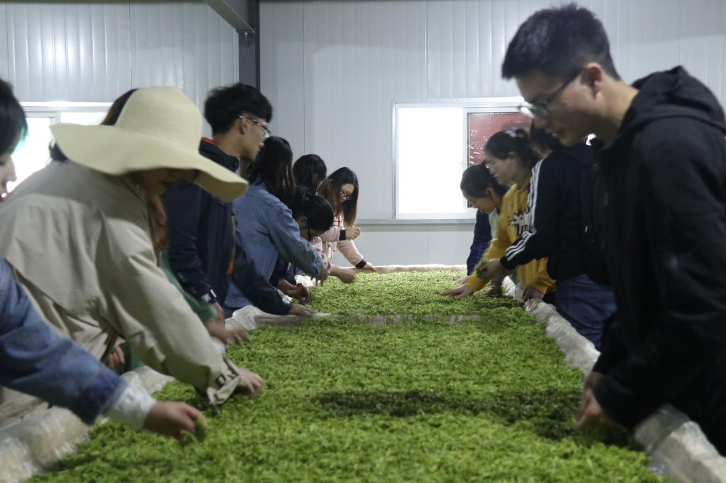 于茶园用过午餐后,下午,同学们开始了挑拣茶叶的工作,严格按照“一芽一叶”的标准,精心挑选出好茶叶。