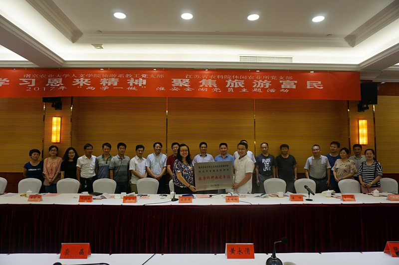 随后,人文学院党委书记朱世桂向金湖县旅游局授牌,两单位结成“教学科研共建单位”,预示着今后双方将展开密切的合作;最后,两联合支部参会各方纷纷围绕“学习恩来精神、聚焦旅游富民”进行主题发言,与金湖休闲农业与乡村旅游的经营主体展开热烈的讨论,为其献计献策。