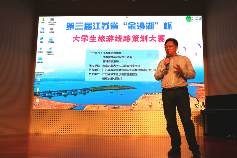 全部选手展示完毕后,首先由江苏省旅游学会周武忠会长进行点评。周会长怀着对母校深厚的感情,对大赛给予了高度评价,认为这次旅游线路策划大赛本质上是一种创新设计,十二组参赛作品主题非常明确、特色非常鲜明,推介方式生动活泼,产品设计极具创意;最后周会长对承办方表达了充分的肯定和诚挚的感谢,也希望本次大赛作为一个整体项目参加更高层次的国际大奖评比。随后盐城旅游局童健局长进行点评,他认为参赛作品都很有创意,项目都便于落地,设计方案利于推广传播,回盐城后要与相关企业沟通,来认购大赛的设计产品;最后童局长对本次大赛的成功举办表示了热烈的祝贺,在全省旅游大发展时机,南农在积极牵头组织旅游线路设计,对比赛承办方南农大人文学院表示了衷心的感谢。