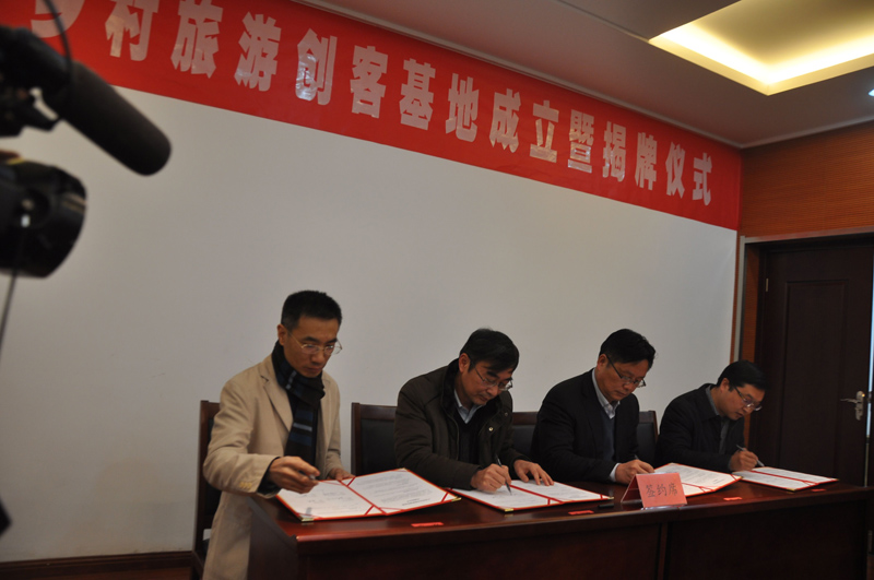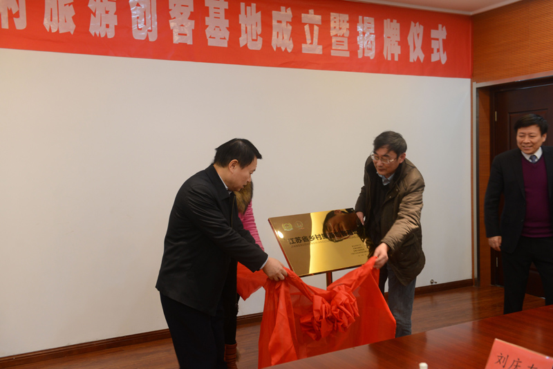 人文学院杨旺生院长、上海艾谷农业科技有限公司戎华执行董事、潘黄街道徐启楼主任共同签署了“江苏省乡村旅游创客示范基地共建协议书”,盐城市人民政府张京麒副市长和南农大杨旺生院长为“江苏省乡村旅游创客示范基地”揭牌。