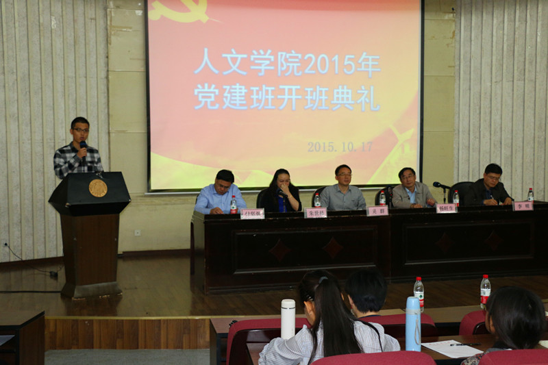 10月17日上午9:00,人文院2015年分党校初级党建班开班典礼在图书馆报告厅举行。出席本次党建班开班典礼的有:校党委组织部部长吴群,院党委书记朱世桂,人文院院长杨旺生,人文院副院长付坚强副教授,文化管理系系主任李明副教授和全体党建班成员。此次典礼由杨旺生主持。
