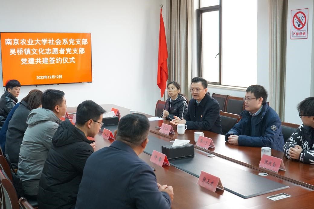共建签约仪式环节,曹斌首先致欢迎辞。他对南农大社会学系教师党支部一行的到来表示热烈欢迎,并简要介绍了双方党建共建的背景和进展情况,希望未来能够依托南农大的优势学科资源在产业项目、人文挖掘、项目申报和技术支持等乡村振兴重点领域形成更加紧密的合作。李日葵代表学院向吴桥镇赠送了由社会学系编写的《农村社会调查文集—扬州市江都区吴桥镇特辑》。随后,杨灿君、张正才分别代表双方党支部签署结对共建协议书。