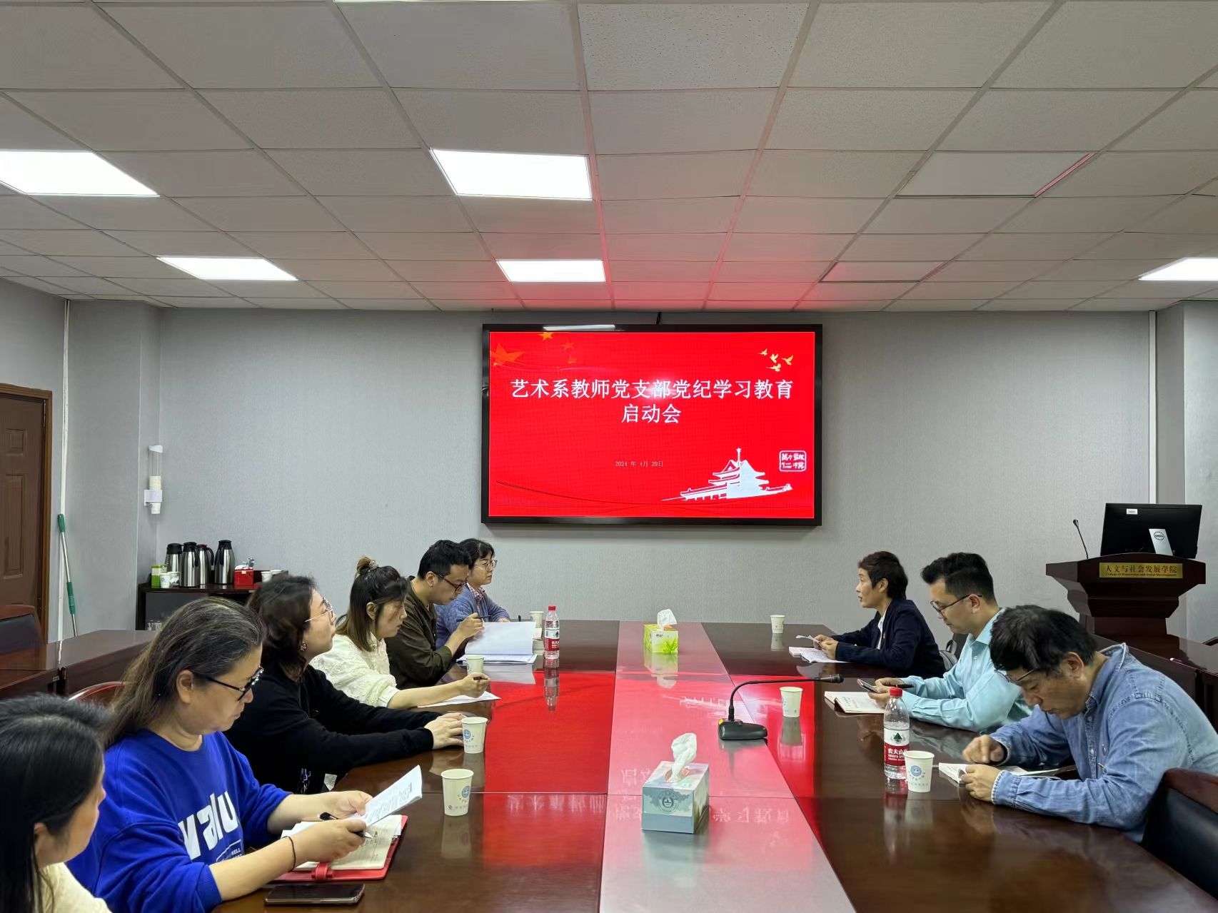 党委的工作部署,艺术系教师党支部在逸夫楼6041室召开了党纪学习教育启动会。会议由支部书记李燕主持,艺术系全体教师参加,党委书记李日葵作为一名普通党员参会。会议的主要目的是深入贯彻落实习近平总书记关于党纪学习教育的重要讲话和重要指示精神,促使全体教师提高对开展学习《中国共产党纪律处分条例》重要性的认识,以及传达学院党委关于开展党纪学习教育的主要精神和具体实施方案。