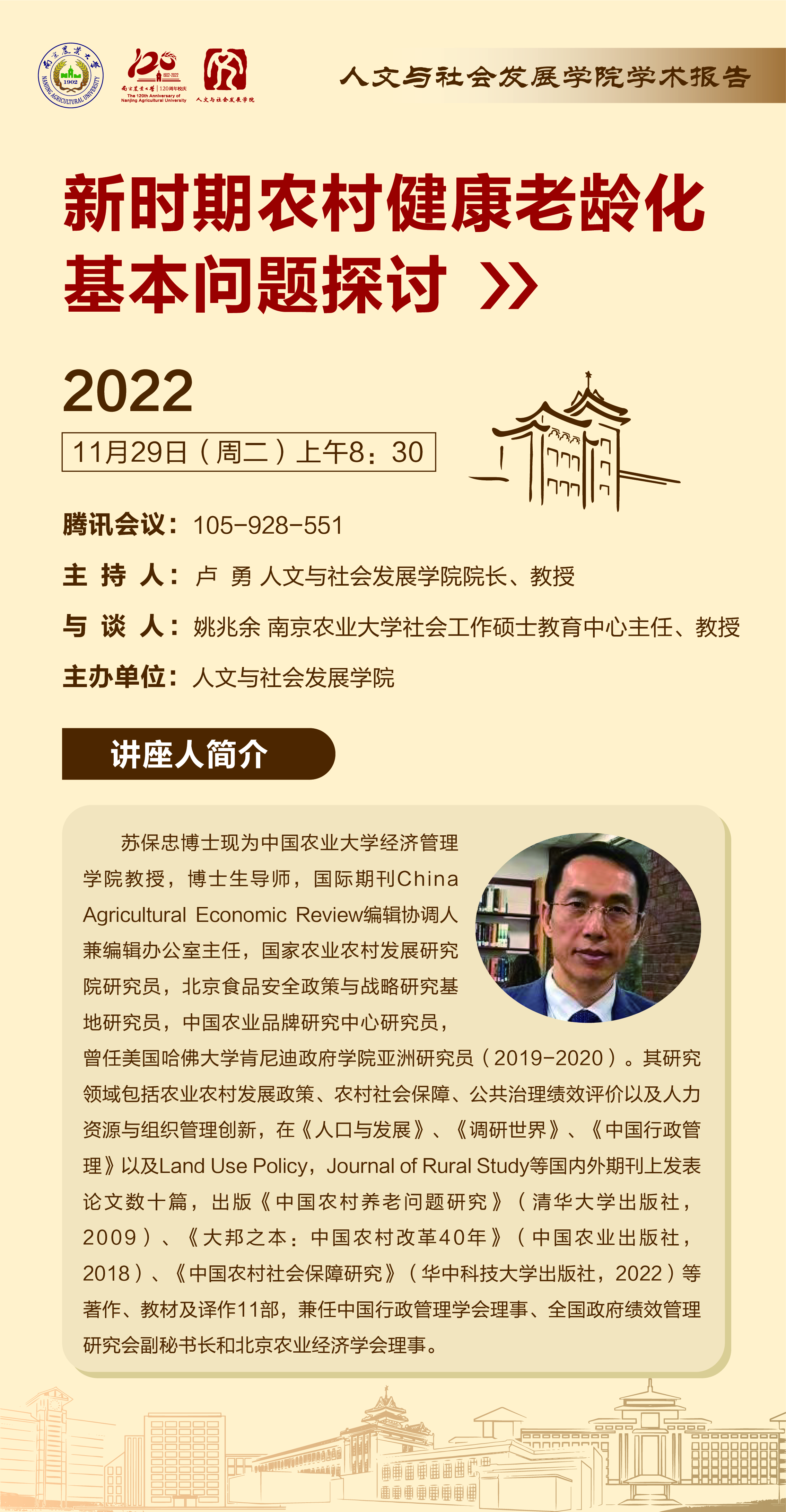 苏保忠博士现为中国农业大学经济管理学院教授,博士生导师,国际期刊China Agricultural Economic Review编辑协调人兼编辑办公室主任,国家农业农村发展研究院研究员,北京食品安全政策与战略研究基地研究员,中国农业品牌研究中心研究员,曾任美国哈佛大学肯尼迪政府学院亚洲研究员(2019-2020)。其研究领域包括农业农村发展政策、农村社会保障、公共治理绩效评价以及人力资源与组织管理创新,在《人口与发展》、《调研世界》、《中国行政管理》以及Land Use Policy,Journal of Rural Study等国内外期刊上发表论文数十篇,出版《中国农村养老问题研究》(清华大学出版社,2009)、《大邦之本:中国农村改革40年》(中国农业出版社,2018)、《中国农村社会保障研究》(华中科技大学出版社,2022)等著作、教材及译作11部,兼任中国行政管理学会理事、全国政府绩效管理研究会副秘书长和北京农业经济学会理事。