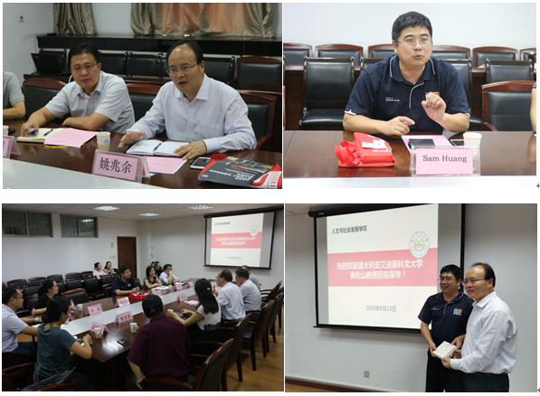 首先,姚兆余院长对黄松山教授的来访表示欢迎,并简要介绍了学校和学院的办学历史、专业设置和学科建设等情况,表示愿意就学院的国际化办学和旅游管理系本科生、研究生的中外联合培养等与迪斯科文大学开展合作。随后,黄松山教授介绍了埃迪斯科文大学商务与法律学院的基本情况,重点就该校旅游管理专业的设置及人才培养状况进行了说明,并与参会人员分享了目前与中国高校已开展的人才合作培养项目。在自由交流环节,双方围绕今后可开展的合作领域和模式进行了探讨,如筹划成立中澳乡村旅游研究中心,组织师生访学交流,开展本科生、研究生暑期夏令营活动等。黄松山教授代表埃迪斯科文大学欢迎我校旅游管理及相关专业学生到该校学习、深造。