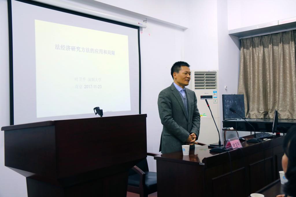 在同学们意犹未尽的掌声中,叶卫平教授也开始了他的精彩演讲。叶卫平教授演讲的题目是“法经济研究方法的应用和局限”。叶卫平教授演讲以锚定效应切入主题:针对同一刑事案件,事先无任何材料的实验组与事先知道一审赔偿的对照组两组在赔偿数额上产生了明显差异。叶卫平教授还举出著名的辛普森案件中美国陪审员制度中的先决判断问题。由此,叶卫平教授引出了经济学研究方法在法学领域内的应用问题。通过上述两例的铺垫,叶卫平教授指出:法律,是基于事实认识的再调整。那么,如何清楚地认识事实呢?此时我们就需要有自己的判断基准线,而跨学科研究方法正是拓宽、延展这条基准线的重要工具。 接下来,叶卫平教授点出了本次讲座的主题——经济分析方法在法律中的应用与局限。在应用方面,叶卫平教授重点谈论了如何运用经济学知识审理“寻租案”。叶卫平教授认为,运用经济学研究方法可以让法律变得更有智慧。但他同时也谈到了哈佛学派与芝加哥学派的不同看法,以及对美国合理原则产生的影响。法学与经济学的跨学科结合为在场的南农学子打开了研究法学领域的新视野,现场掌声雷动。叶卫平教授同时提到了经济分析方法的局限性,因为“经济分析”的运用导致美国法院否决了一些先例,与美国“遵循判例”的原则不符,引起了法律人的恐慌。叶卫平教授分析了这种现象与局限性产生的原因。最后,叶卫平教授带领听众延伸思考了社科法学与教义的论仗,在场师生无不认真思索。在叶卫平教授精彩的演讲结束后,在座听众纷纷鼓掌,钦佩不已。