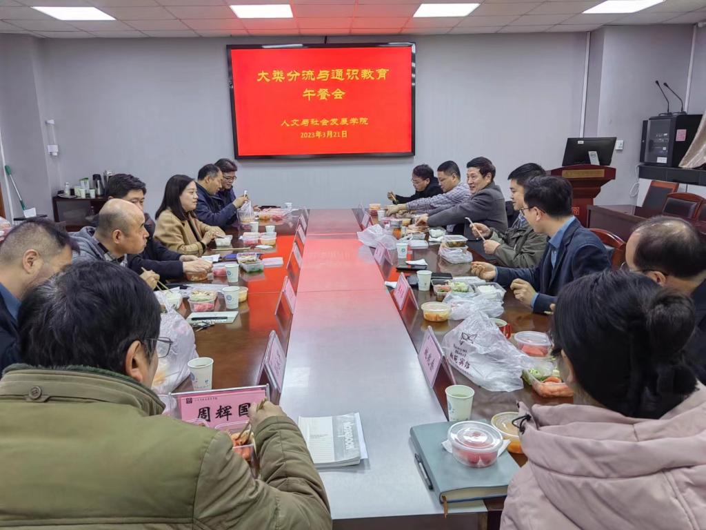 在逸夫楼6041举行大类分流与通识教育教学午餐会。教务处处长张炜、副处长白振田应邀参加,科学技术史学科点点长盛邦跃教授、原学院院长姚兆余教授、学院现领导班子李日葵书记、卢勇院长、冯绪猛副书记、戚晓明副院长及各系主任、教师代表、学生代表一起参加交流。
