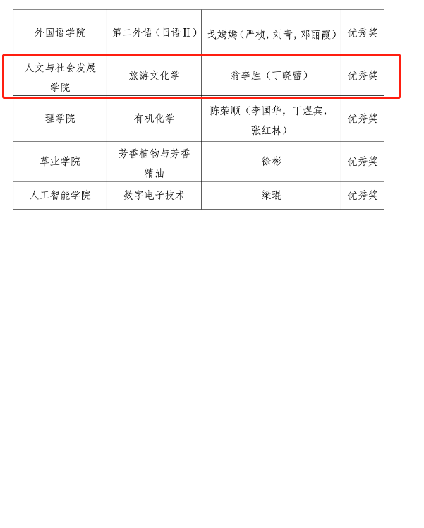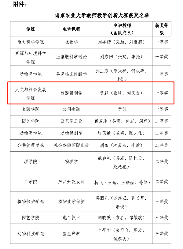 黄颖、崔峰、刘庆友团队主讲的“旅游策划学”,翁李胜、丁晓蕾团队主讲的“旅游文化学”,分别获得学校教师教学创新大赛一等奖和优秀奖。